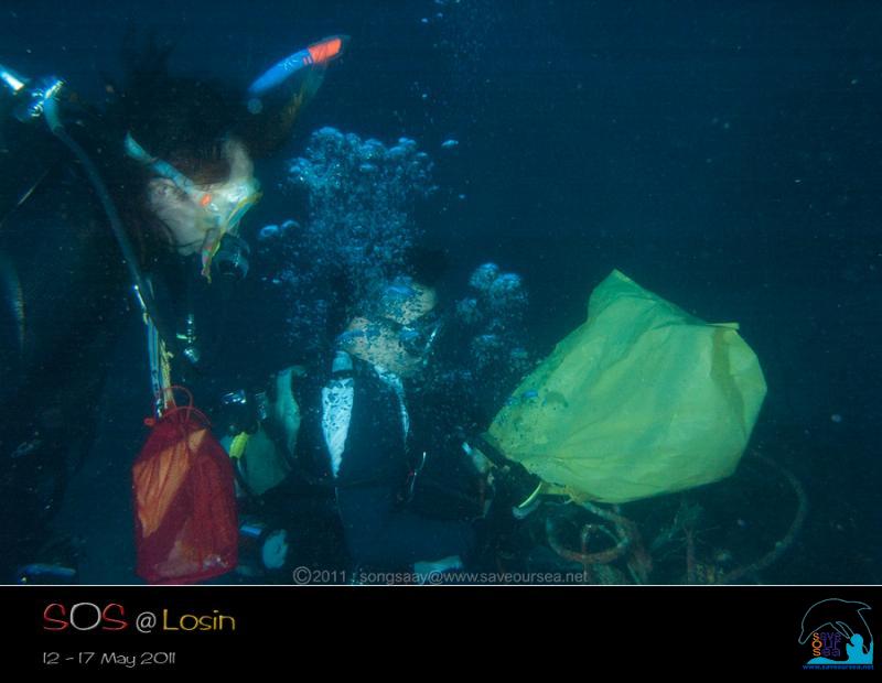 บริเวณด้านเหนือและตะวันตกเฉียงเหนือของกองหินจม...เราได้พบเศษอวนและสายเบ็ดยาวยืด กระจายอยู่ทั่วไป ปล่อยไว้ไม่ได้ค่ะ ต้องกำจัดให้หมด... น้องหมอเมธประกบคู่กับน้องใหม่ไฟแรง...น้องโน๊ต จัดการกับอวนกองใหญ่...