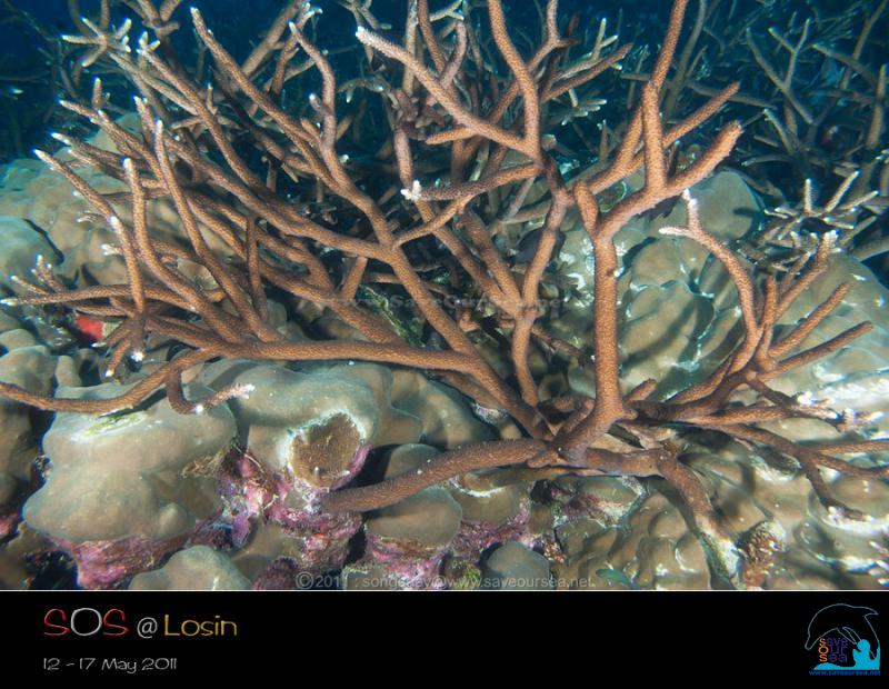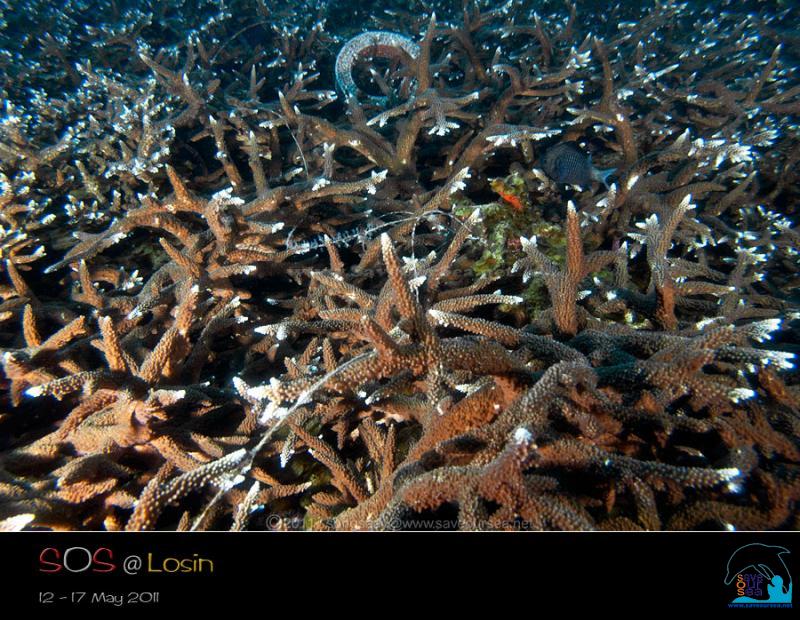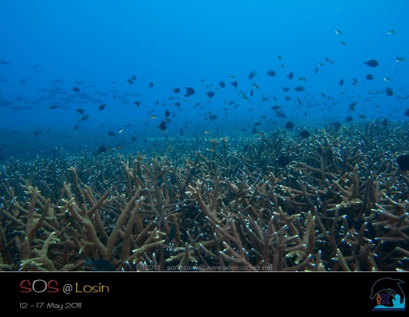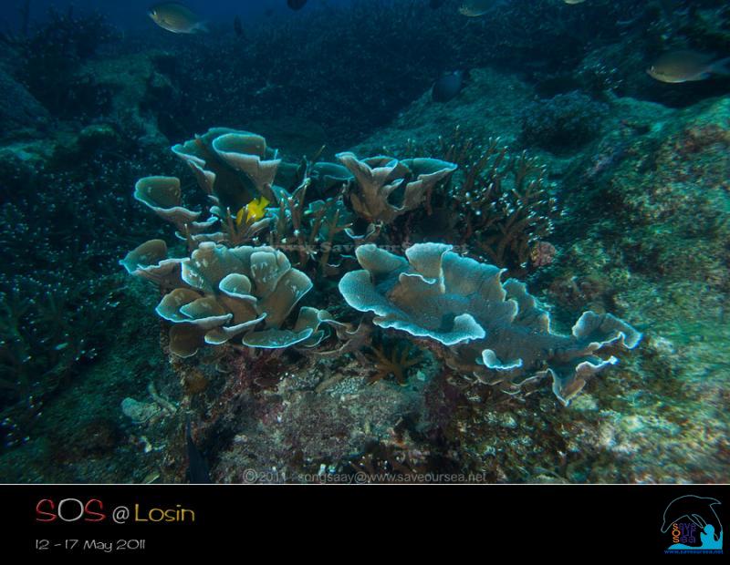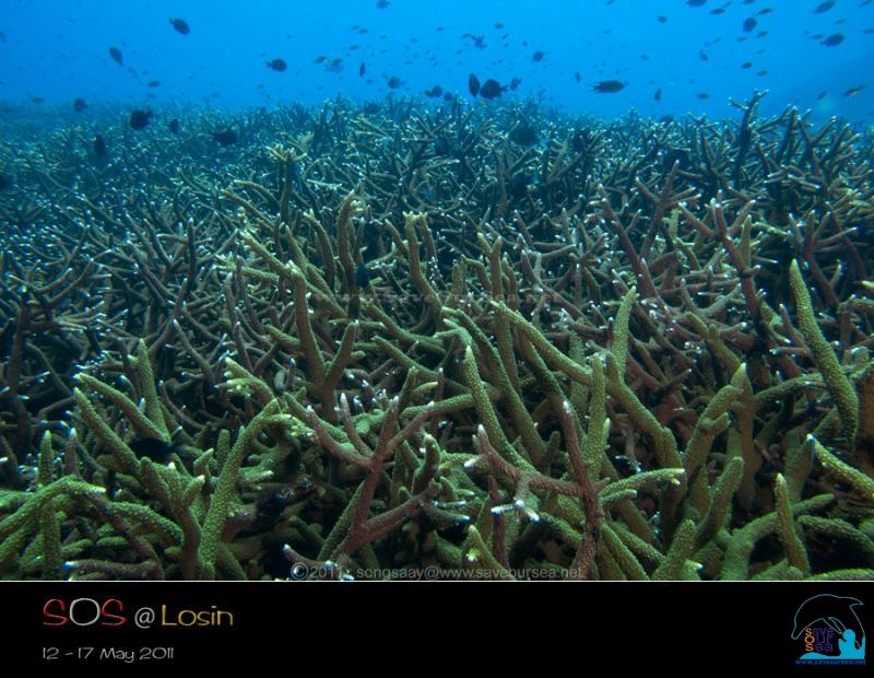 กองหินโลซินด้านตะวันตก หลังจากดำไดฟ์แรกที่ด้านเหนือของกองหินโลซินเสร็จสิ้นลง เราได้รับประทานอาหารเช้ากัน อิ่มหนำสำราญกันดีแล้ว หัวหน้าทีมก็ไปดูแลแยกและชั่งขยะและเศษอวนที่เก็บขึ้นพักมาได้ ก่อนจะแยกย้ายกันไปพักผ่อน ใกล้เที่ยงก็ถึงเวลาลงดำน้ำไดฟ์ต่อไป ซึ่งครั้งนี้เราจะไปลงดำน้ำกันที่ด้านตะวันตกของกองหินโผล่... ท้องฟ้าแจ่มใส แดดจึงส่องแสงแรงกล้า ใต้ท้องน้ำจึงดูสว่างสดใสกว่าเมื่อไดฟ์แรกมาก เราตื่นตาตื่นใจกับแนวปะการังแข็ง ที่สวยงามและสมบูรณ์ มองไปได้กว้างไกลสุดสายตา ปะการังที่เห็นละลานตาไปหมดนั้น มีทั้งที่อยู่บนโขดหินและบนพื้นทราย ทอดตัวยาวไปตามแนวกองหิน และค่อยๆลาดเอียงไปโดยรอบ ปะการังแข็งที่เห็นมากที่สุด คือปะการังเขากวางชนิดต่างๆ รองลงมาคือปะการังจาน และปะการังโขด