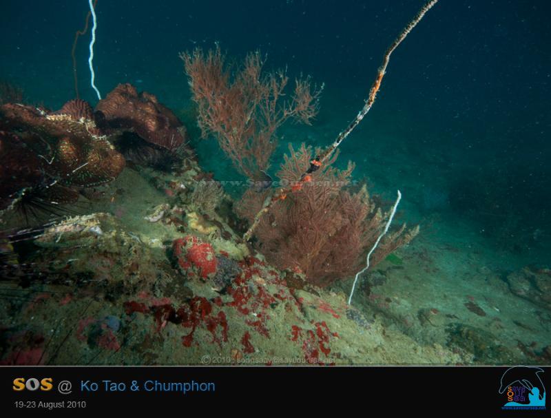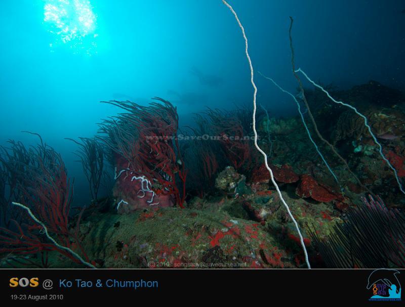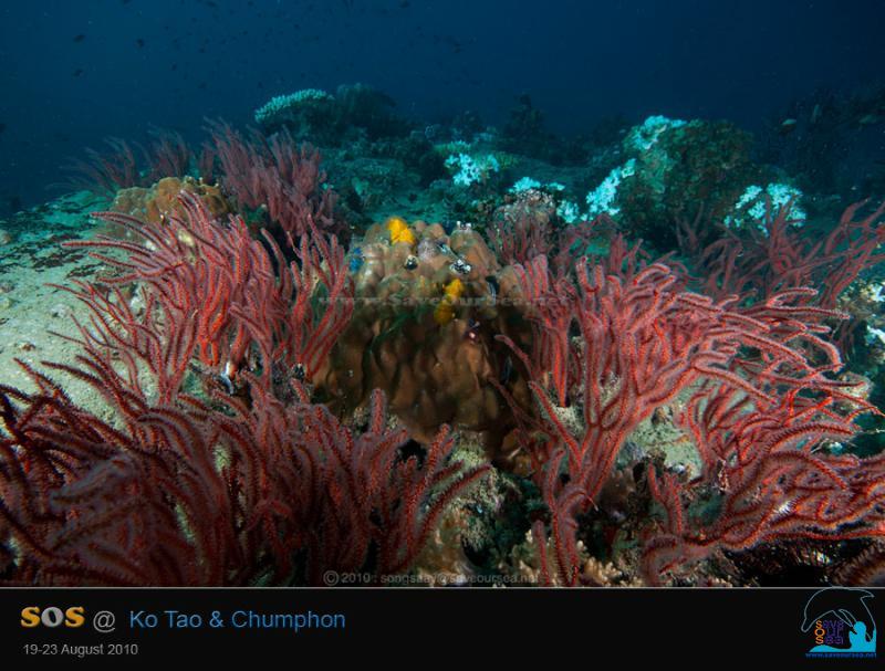 ปะการังโขดแทรกอยู่ในดงแส้ทะเล.... บนปะการังโขด มีหนอนฉัตรส่งหนวดสีสันแพรวพราวเหมือนเพชรพลอยออกมาอวดความงาม อืมมมม...ร่องรอยของการฟอกขาวยังมีให้เห็นอยู่ที่นี่...