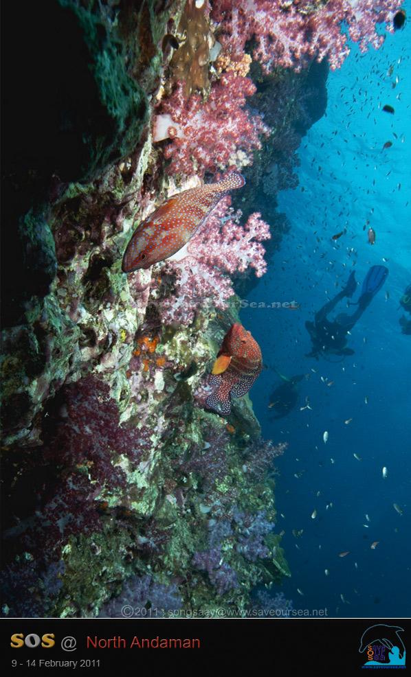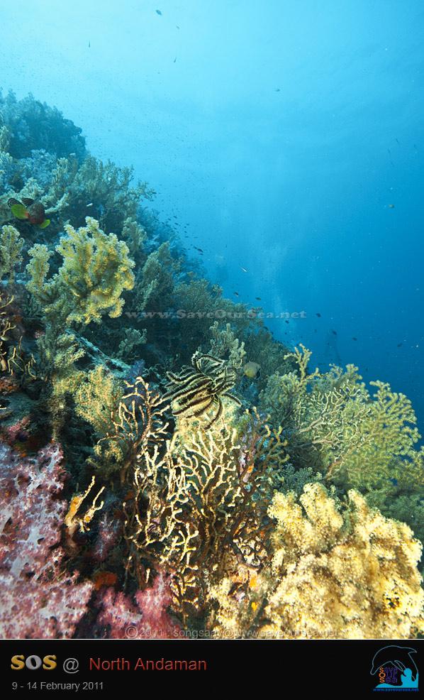 บริเวณเชิงผาที่ลาดชัน ปะการังอ่อนและกัลปังหาพัดยังขึ้นอยู่ทั่วไป...