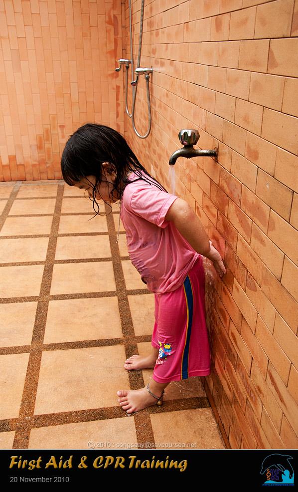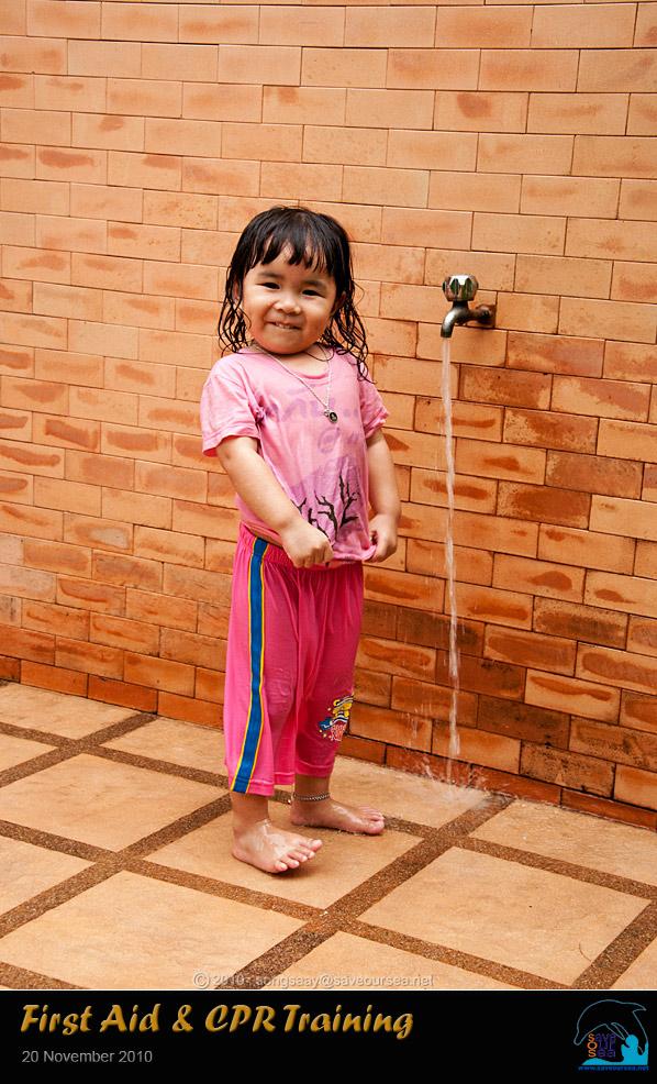 น้ำก็เย็น ลมก็โชยมาตลอด แต่น้องอันดาไม่รู้สึกหนาว ยังแอบมาเล่นน้ำก๊อกต่ออีก ... ยืนหันหลังเล่นอยู่แบบนี้ เขย่งเท้าเป็นระยะๆ เล่นอะไรของเธอน๊า
