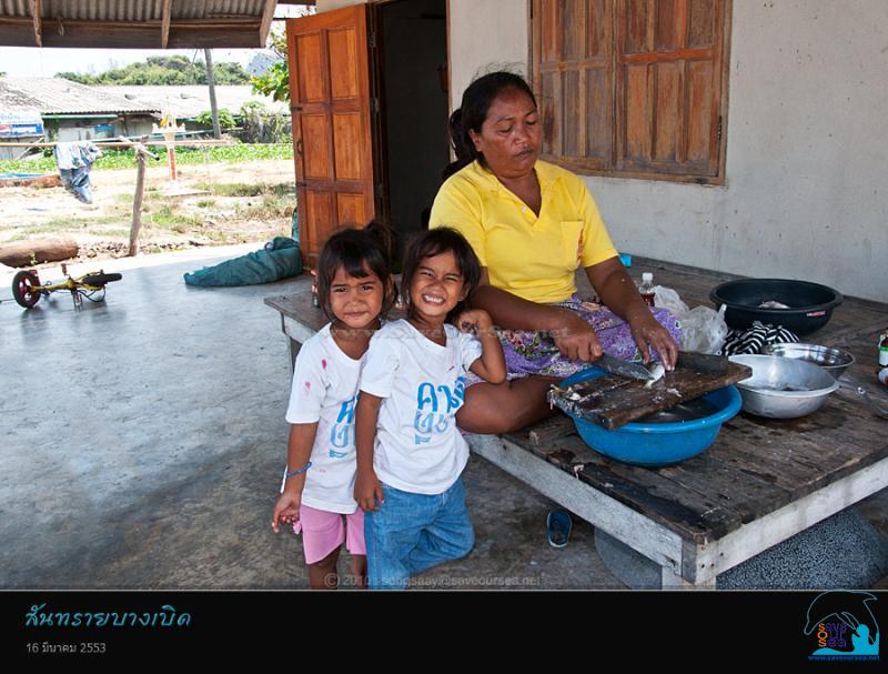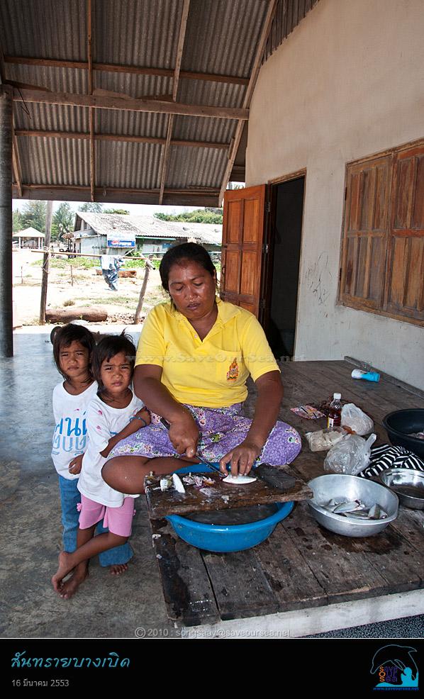 ชาวประมงหญิงวัยกลางคน..แม่ของลูกแฝดตัวน้อย นั่งทำปลาอยู่หน้าบ้าน....