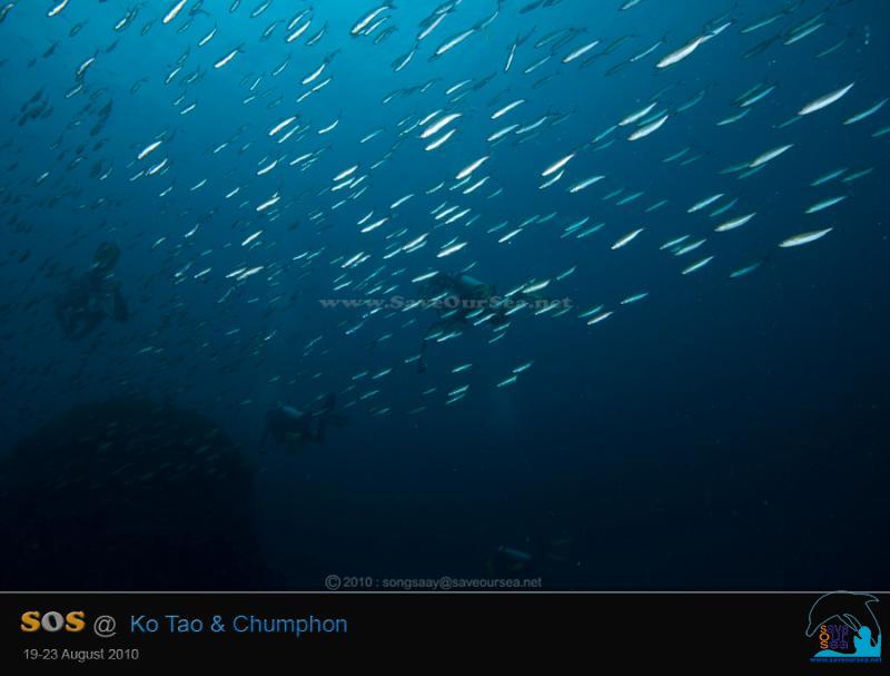 ที่กลางน้ำห่างจากกองหิน....หลังฝูงปลากล้วย (Fusillier) มีฝูงปลาอะไรว่ายอยู่นะ....