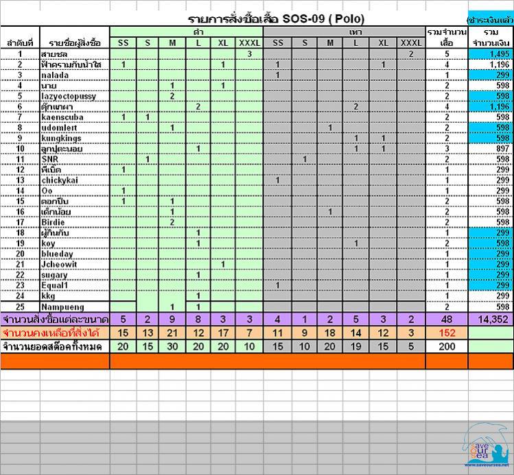 T-shirt XL สีขาว, เทา,และดำ อย่างละ 2 ตัว T-shirt SS สีขาว, เทา,และดำ อย่างละ 1 ตัว T-shirt S สีขาว, เทา,และดำ อย่างละ 1 ตัว POLO XL สีเทา 3 ตัว สีดำ 2 ตัว POLO SS สีเทา 1 ตัว สีดำ 1 ตัว POLO S สีเทา 1 ตัว สีดำ 1 ตัว |