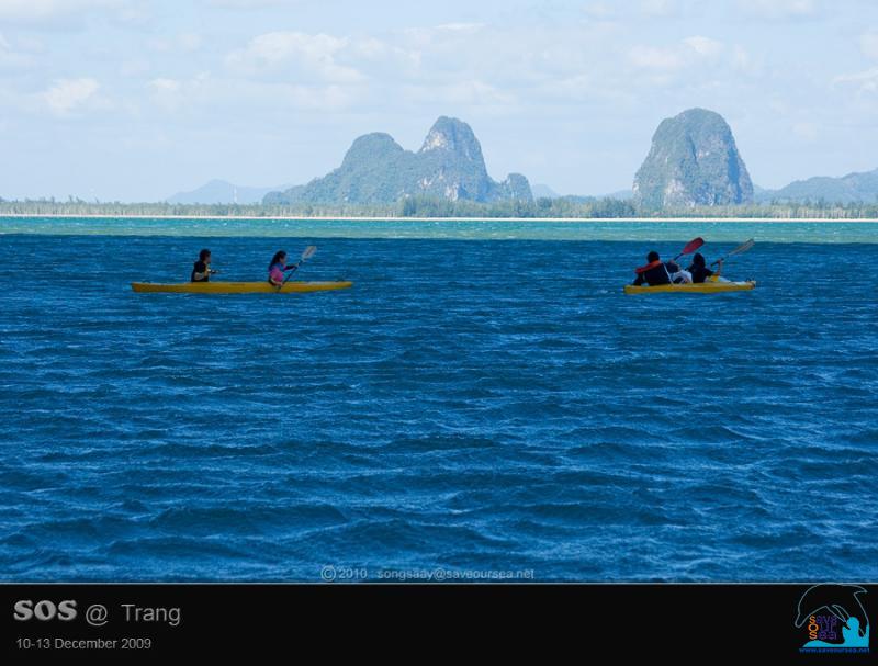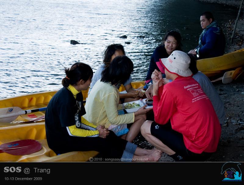 ใช้เวลาเพียงไม่นาน พวกเราก็ลงกล้าไม้เสร็จสิ้น ... เรือหางยาวพาพวกเราย้อนกลับไปทางหาดราชมงคล เพื่อหาทำเลเหมาะทานข้างกลางวันกันก่อน ถ้าอิ่มหนำสำราญกันแล้ว ค่อยพายเรือคายัคก่อนต่อ แต่ สิ่งที่ผิดคาดอย่างที่ห้าคือ .... ลมแรงมากๆ ดูเหมือนจะมาจากทุกทิศทุกทาง กว่าจะหามุมเหมาะๆเพื่อทานอาหารกันได้ ก็ทุลักทุเลกันพอดู