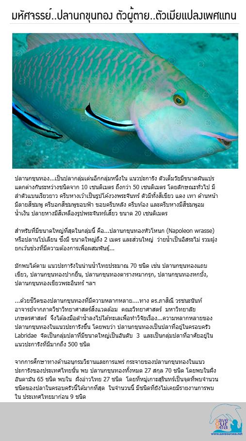 มหัศจรรย์ ...... ปลานกขุนทอง ตัวผู้ตาย ... ตัวเมียแปลงเพศแทน จาก ................ ไทยรัฐ วันที่ 5 เมษายน 2544