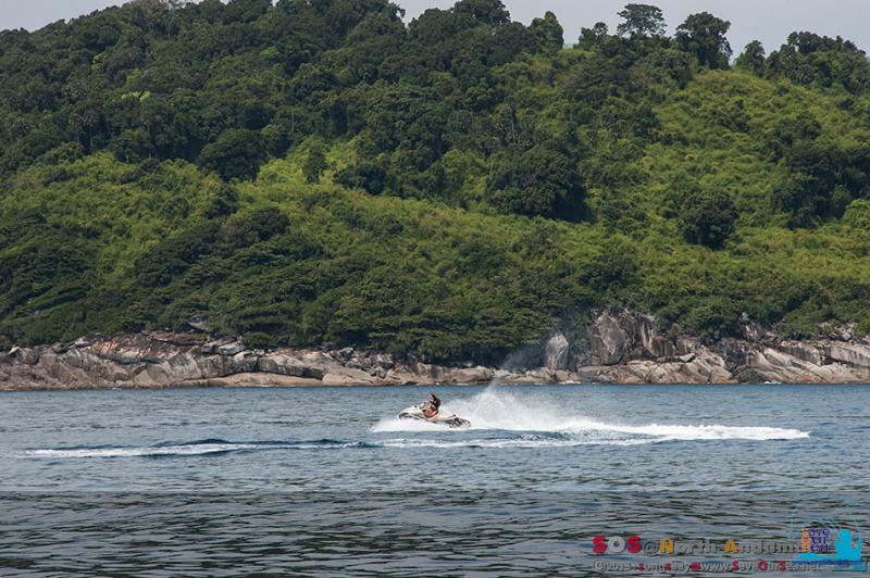 หลังจากเสร็จสิ้นภารกิจของสมาชิก SOS ในเขต อช.หมู่เกาะสิมิลัน และ อช.หมู่เกาะสุรินทร์ ก่อนจะเดินทางกลับเข้าฝั่งที่ จ.ภูเก็ต ... ดร.ก้องเกียรติ ที่ได้ร่วมคณะมากับ SOS ด้วย ได้พาสมาชิกขึ้นไปยังเกาะ 1 เพื่อเยี่ยมชมโครงการอนุรักษ์เต่า ที่ทาง ทช. ทำร่วมกับ อช.และกองทัพเรือ และ เพื่อไปเก็บขยะที่มีอยู่เกลื่อนกลาดหน้าชายหาดด้วย ที่หน้าชายหาดเกาะ 1 พบว่า มีเรือสำราญ (ไม่ใช่สัญชาติไทย) ลำหนึ่งจอดทอดสมออยู่ โดยมี Jetski 2 ลำ วิ่งฉวัดเฉวียนไปมา เป็นที่น่าหวาดเสียวว่า หากมีเต่าว่ายผ่านมาน่าจะมีโอกาสหัวแบะหรือกระดองแตกได้ และเสียงของ Jetski อาจจะทำให้เต่าตกใจไข่หด ไม่ขึ้นมาวางไข่ได้ ... จากการที่ได้สอบถามเจ้าหน้าที่ทหารเรือที่ประจำเวรเฝ้าอนุบาลเต่าที่เกาะ 1 ทราบว่า ได้วิทยุแจ้งให้เจ้าหน้าที่อุทยานที่เกาะ 4 ทราบแล้ว และจะเดินทางมาที่จุดนี้อีก 1 ชั่วโมงข้างหน้า เจ้าหน้าที่ทหารเรืออยากจะออกไปห้ามและตักเตือนให้หยุดกระทำ เนื่องจากบริเวณเกาะ 1 ถึงเกาะ 3 เป็นเขตอนุรักษ์ที่ห้ามเข้ามาทำกิจกรรมใดๆทั้งสิ้น แต่ไม่สามารถกระทำได้ เนื่องจากเรือที่มีอยู่ ชำรุดใช้การไม่ได้ ... เรา คือ สองสาย, ดร.ก้องเกียรติ, เจ้าหน้าที่ทหารเรือ และสมาชิก SOS อีก 2 คน ได้ใช้เรือดิงกี้ของเรือฟ้าใส วิ่งไปยังเรือดังกล่าว พบว่า เป็นเรือต่างชาติชื่อ "Newcastle Explorer" ซึ่งทั้งลูกเรือ และผู้โดยสารเป็นชาวต่างชาติทั้งสิ้น จึงได้ตักเตือนและแจ้งให้ทราบว่า บริเวณนี้เป็นเขตอุทยาน และยังเป็นเขตอนุรักษ์เต่าอีกด้วย การเข้ามากระทำการดังกล่าวโดยไม่ได้ขออนุญาตจากเจ้าหน้าที่ถือเป็นความผิด ... พวกเขารับฟังและยอมรับว่า ไม่ทราบมาก่อนว่าเป็นเขตหวงห้าม หลังจากนั้นจึงได้เก็บเรือ Jetski และถอนสมอวิ่งออกจากเขตอุทยานไป นี่เป็นครั้งที่ 2 ที่มีการกระทำแบบนี้ในเขต อช.หมู่เกาะสิมิลัน โดยครั้งนี้เป็นชาวต่างชาติที่บอกว่าไม่ได้รับทราบถึงกฎระเบียบข้อห้ามมาก่อน แต่ครั้งก่อน เท่าที่ทราบเป็นคนไทย เป็นใครขอไม่เอ่ยถึงดีกว่า .....