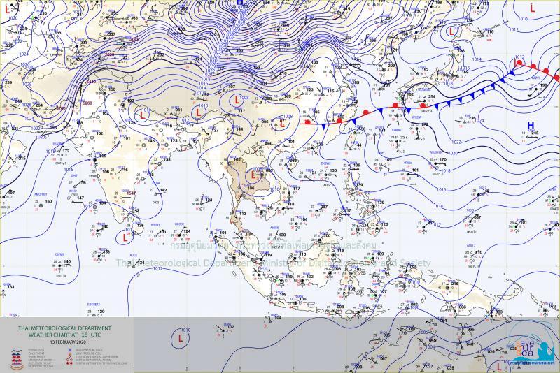 สภาวะอากาศทั่วไป พยากรณ์อากาศ 24 ชั่วโมงข้างหน้า ภาคเหนือมีอากาศเย็นถึงหนาว สำหรับภาคตะวันออกเฉียงเหนือ ภาคกลาง และภาคตะวันออก มีหมอกในตอนเช้าและมีฝนบางพื้นที่ ส่วนภาคตะวันออกมีฝนลดลง และคลื่นลมบริเวณอ่าวไทยมีกำลังอ่อนลง โดยบริเวณอ่าวไทยตอนล่างตั้งแต่จังหวัดนครศรีธรรมราชลงไปทะเลมีคลื่นสูง 1-2 เมตร ฝุ่นละอองในระยะนี้ ลมตะวันออกเฉียงใต้พัดปกคลุมภาคกลางรวมทั้งกรุงเทพมหานครและปริมณฑล ทำให้การสะสมของฝุ่นละออง/หมอกควัน ลดลง ส่วนภาคเหนืออากาศยกตัวได้ไม่ดีในตอนเช้าและลมอ่อน ทำให้ตอนเช้ามีการสะสมฝุ่นละออง/หมอกควัน ส่วนตอนบ่ายจะดีขึ้นเนื่องจากอากาศยกตัวได้ดี กรุงเทพมหานครและปริมณฑล เมฆบางส่วนกับมีหมอกบางในตอนเช้า และมีฝนเล็กน้อยบางแห่ง อุณหภูมิต่ำสุด 25-26 องศาเซลเซียส อุณหภูมิสูงสุด 34-37 องศาเซลเซียส ลมตะวันออกเฉียงใต้ ความเร็ว 10-20 กม./ชม. คาดหมาย ในช่วงวันที่ 13 - 15 ก.พ. 63 ประเทศไทยตอนบนมีหมอกในตอนเช้า และอุณหภูมิจะสูงขึ้น 1-3 องศาเซลเซียสในภาคตะวันออกเฉียงเหนือ ภาคกลาง และภาคตะวันออก กับมีฝนเล็กน้อยบางแห่ง แต่ยังคงมีอากาศหนาวเย็นในตอนเช้าในภาคเหนือและภาคตะวันออกเฉียงเหนือ โดยภาคเหนือตอนบนอุณหภูมิจะลดลง 1-3 องศาเซลเซียส บริเวณยอดดอยและยอดภูมีอากาศหนาวถึงหนาวจัดและมีน้ำค้างแข็งบางพื้นที่ อุณหภูมิต่ำสุด 2-12 องศาเซลเซียส สำหรับภาคใต้ในช่วงวันที่ 13 - 15 ก.พ. 63 จะมีฝนลดลง และคลื่นลมบริเวณอ่าวไทยมีกำลังอ่อนลง โดยบริเวณอ่าวไทยตอนล่างตั้งแต่จังหวดนครศรีธรรมราชลงไปทะเลมีคลื่นสูง 1-2 เมตร ส่วนในช่วงวันที่ 16 - 19 ก.พ. ภาคตะวันออกเฉียงเหนือ มีอากาศหนาวเย็นลงและอุณหภูมิจะลดลง 2-4 องศาเซลเซียส กับมีลมแรง ส่วนภาคกลาง และภาคตะวันออก อุณหภูมิจะลดลง 1-3 องศาเซลเซียส สำหรับภาคใต้จะมีฝนเพิ่มขึ้น และคลื่นลมบริเวณอ่าวไทยและทะเลอันดามันมีกำลังแรงขึ้น โดยบริเวณอ่าวไทยตอนล่างตั้งแต่จังหวดนครศรีธรรมราชลงไปทะเลมีคลื่นสูงประมาณ 2 เมตร บริเวณที่มีฝนฟ้าคะนองคลื่นสูง 2-3 เมตร ข้อควรระวัง ในช่วงวันที่ 13 - 15 ก.พ. 63 ขอให้ประชาชนบริเวณภาคเหนือตอนบนดูแลรักษาสุขภาพเนื่องจากสภาพอากาศที่หนาวเย็นลงไว้ด้วย สำหรับชาวเรือบริเวณอ่าวไทยตอนล่างควรเพิ่มความระมัดระวังในการเดินเรือ ในช่วงวันที่ 16 - 19 ก.พ. 63 ขอให้ประชาชนบริเวณภาคตะวันออกเฉียงเหนือ ภาคกลาง และภาคตะวันออก ดูแลรักษาสุขภาพเนื่องจากสภาพอากาศที่หนาวเย็นลง ชาวเรือบริเวณอ่าวไทยและทะเลอันดามันควรเพิ่มความระมัดระวังในการเดินเรือ |