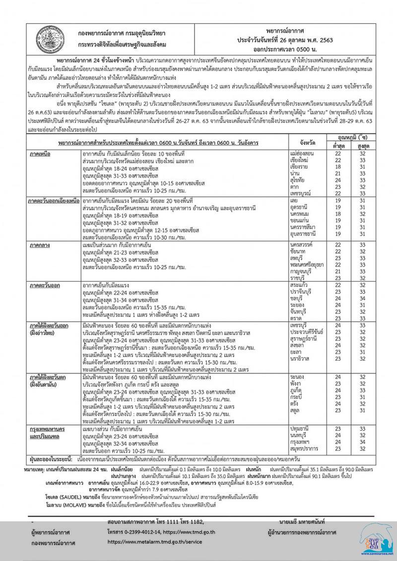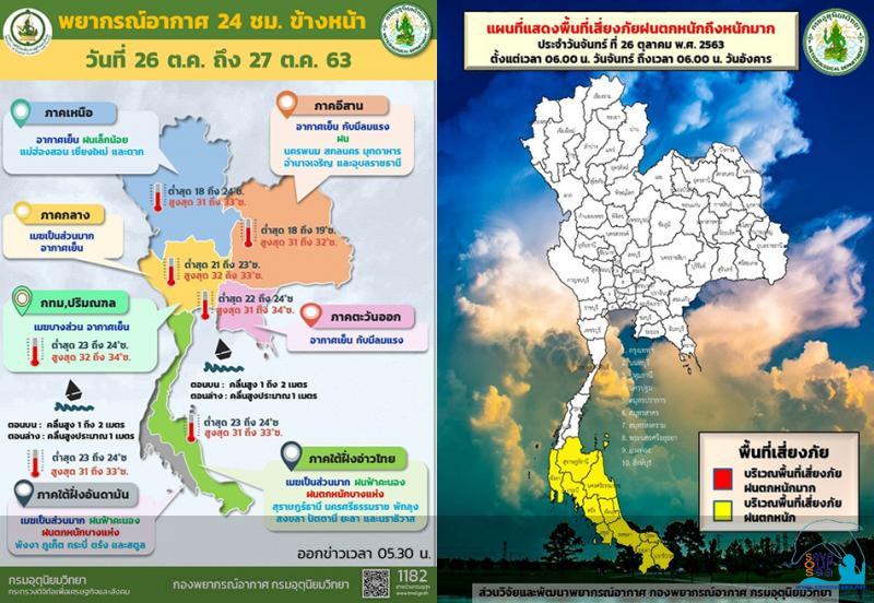 กราฟิกพยากรณ์อากาศรายภาคของประเทศไทยพร้อมแผนที่เสี่ยงภัยฝนตกหนักถึงหนักมากบริเวณประเทศไทย ประจำวันที่ 26 ตุลาคม 2563 ข้อมูล ณ เวลา 05.30 น.