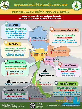 คาดหมายลักษณะอากาศ ในช่วงวันที่ 7 ? 9 มิ.ย. 65 ร่องมรสุมพาดผ่านประเทศลาวตอนบนและประเทศเวียดนามตอนบนเข้าสู่หย่อมความกดอากาศต่ำที่ปกคลุมบริเวณประเทศเวียดนามตอนบนและอ่าวตังเกี๋ย ประกอบกับมรสุมตะวันตกเฉียงใต้พัดปกคลุมทะเลอันดามัน ประเทศไทย และอ่าวไทย ทำให้ประเทศไทยตอนบนมีฝนเพิ่มขึ้นและมีฝนตกหนักบางแห่ง บริเวณภาคเหนือ ภาคตะวันออกเฉียงเหนือ ภาคกลาง รวมทั้งกรุงเทพมหานครและปริมณฑล ภาคตะวันออก ส่วนในช่วงวันที่ 10 ? 12 มิ.ย. 65 หย่อมความกดอากาศปกคลุมประเทศเวียดนามตอนบน ประกอบกับมรสุมตะวันตกเฉียงใต้กำลังที่พัดปกคลุมทะเลอันดามัน ประเทศไทย และอ่าวไทยมีกำลังแรงขึ้น ทำให้ประเทศไทยยังคงมีฝนฟ้าคะนองเกิดขึ้นและมีฝนตกหนักบางแห่ง สำหรับคลื่นลมบริเวณทะเลอันดามัน และอ่าวไทยตอนบน ทะเลมีคลื่นสูง 1-2 เมตร บริเวณที่มีฝนฟ้าคะนองคลื่นสูงมากกว่า 2 เมตร ตลอดช่วง