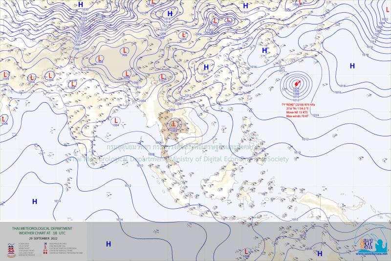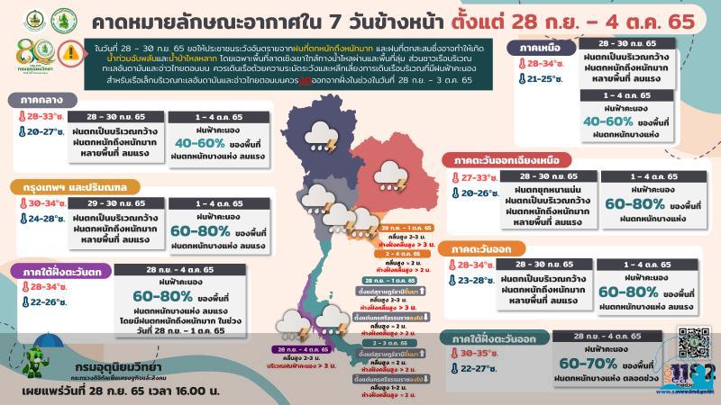 ประกาศกรมอุตุนิยมวิทยา เมื่อเวลา 19.00 น. ของวันนี้ (29 ก.ย. 65) พายุดีเปรสชัน ?โนรู? มีศูนย์กลางอยู่บริเวณอำเภอเมือง จังหวัดชัยภูมิ ได้อ่อนกำลังลงเป็นหย่อมความกดอากาศต่ำกำลังแรงแล้ว ประกอบกับมรสุมตะวันตกเฉียงใต้ที่พัดปกคลุมทะเลอันดามัน ภาคใต้ และอ่าวไทยมีกำลังแรง ส่งผลทำให้ยังคงมีฝนตกหนักถึงหนักมากบางแห่ง บริเวณภาคเหนือ ภาคตะวันออกเฉียงเหนือ ภาคกลาง รวมทั้งกรุงเทพมหานครและปริมณฑล ภาคตะวันออก และภาคใต้ ขอให้ประชาชนในบริเวณดังกล่าวระวังอันตรายจากฝนตกหนักและฝนที่ตกสะสม ซึ่งอาจทำให้เกิดน้ำท่วมฉับพลันและน้ำป่าไหลหลาก โดยเฉพาะพื้นที่ลาดเชิงเขาใกล้ทางน้ำไหลผ่านและพื้นที่ลุ่มต่อไปอีก 1 วัน"พายุ โนรู" ฉบับที่ 24 ลงวันที่ 29 กันยายน 2565 จังหวัดที่คาดว่าจะมีฝนตกหนักบางแห่ง มีดังนี้ วันที่ 29 กันยายน 2565 ภาคเหนือ: จังหวัดลำพูน ลำปาง น่าน แพร่ อุตรดิตถ์ สุโขทัย ตาก กำแพงเพชร พิจิตร พิษณุโลก และเพชรบูรณ์ ภาคตะวันออกเฉียงเหนือ: จังหวัดเลย ชัยภูมิ ขอนแก่น นครราชสีมา บุรีรัมย์ และสุรินทร์ ภาคกลาง: จังหวัดนครสวรรค์ อุทัยธานี ชัยนาท ลพบุรี สระบุรี สิงห์บุรี อ่างทอง รวมทั้งกรุงเทพมหานครและปริมณฑล ภาคตะวันออก: จังหวัดนครนายก ปราจีนบุรี ฉะเชิงเทรา ชลบุรี สระแก้ว ระยอง จันทบุรี และตราด ภาคใต้: จังหวัดเพชรบุรี ประจวบคีรีขันธ์ ชุมพร สุราษฎร์ธานี นครศรีธรรมราช พัทลุง ระนอง พังงา ภูเก็ต กระบี่ ตรัง และสตูล วันที่ 30 กันยายน 2565 ภาคเหนือ: จังหวัดแม่ฮ่องสอน เชียงใหม่ ลำพูน ลำปาง แพร่ อุตรดิตถ์ สุโขทัย ตาก กำแพงเพชร พิจิตร พิษณุโลก และเพชรบูรณ์ ภาคกลาง: จังหวัดนครสวรรค์ อุทัยธานี ชัยนาท กาญจนบุรี และราชบุรี ภาคตะวันออก: จังหวัดระยอง จันทบุรี และตราด ภาคใต้: จังหวัดระนอง พังงา ภูเก็ต และกระบี่ สำหรับคลื่นลมบริเวณทะเลอันดามันและอ่าวไทยมีกำลังค่อนข้างแรง โดยทะเลอันดามันและอ่าวไทยตอนบนมีคลื่นสูง 2-3 เมตร บริเวณที่มีฝนฟ้าคะนองคลื่นสูงมากกว่า 3 เมตร ส่วนอ่าวไทยตอนล่างทะเลมีคลื่นสูงประมาณ 2 เมตร บริเวณที่มีฝนฟ้าคะนองคลื่นสูงมากกว่า 2 เมตร ขอให้ชาวเรือเดินเรือด้วยความระมัดระวัง เรือเล็กบริเวณทะเลอันดามันและอ่าวไทยตอนบนควรงดออกจากฝั่งจนถึงวันที่ 1 ต.ค. 65 จึงขอให้ประชาชนติดตามประกาศจากกรมอุตุนิยมวิทยา และสามารถติดตามข้อมูลที่เว็บไซต์กรมอุตุนิยมวิทยา http://www.tmd.go.th หรือที่ 0-2399-4012-13 และ 1182 ได้ตลอด 24 ชั่วโมง *********************************************** สภาวะอากาศทั่วไป พยากรณ์อากาศ 24 ชั่วโมงข้างหน้า หย่อมความกดอากาศต่ำกำลังแรงปกคลุมบริเวณภาคเหนือตอนล่าง ภาคกลางตอนบน และภาคตะวันออกเฉีย