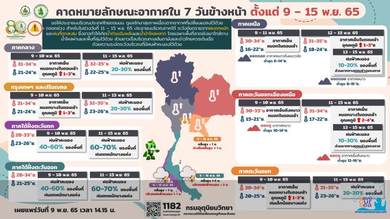 ส่วนในช่วงวันที่ 11 ? 15 พ.ย. 65 บริเวณความกดอากาศสูงหรือมวลอากาศเย็นกำลังปานกลางที่ปกคลุมประเทศไทยตอนบนเริ่มมีกำลังอ่อนลง ในขณะที่มีลมตะวันออกและลมตะวันออกเฉียงใต้พัดปกคลุมทะเลจีนใต้ ภาคเหนือตอนล่าง ภาคตะวันออกเฉียงเหนือตอนล่าง ภาคกลางรวมทั้งกรุงเทพมหานครและปริมณฑล และภาคตะวันออก ลักษณะเช่นนี้ทำให้ประเทศไทยตอนบนยังคงมีอากาศเย็น กับมีหมอกในตอนเช้า และอุณหภูมิจะสูงขึ้น 1-3 องศาเซลเซียสในภาคเหนือ ภาคกลาง และภาคตะวันออก ส่วนภาคตะวันออกเฉียงเหนืออุณหภูมิจะสูงขึ้น 2-4 องศาเซลเซียส โดยมีฝนฟ้าคะนองบริเวณภาคตะวันออกเฉียงเหนือตอนล่าง ภาคกลาง รวมทั้งกรุงเทพมหานครและปริมณฑล และภาคตะวันออก สำหรับหย่อมความกดอากาศต่ำปกคลุมประเทศมาเลเซีย ในขณะที่มรสุมตะวันออกเฉียงเหนือและลมตะวันออกที่พัดปกคลุมอ่าวไทย ภาคใต้ และทะเลอันดามันจะมีกำลังแรงขึ้น ทำให้ภาคใต้มีฝนเพิ่มขึ้นและมีฝนตกหนักบางแห่ง