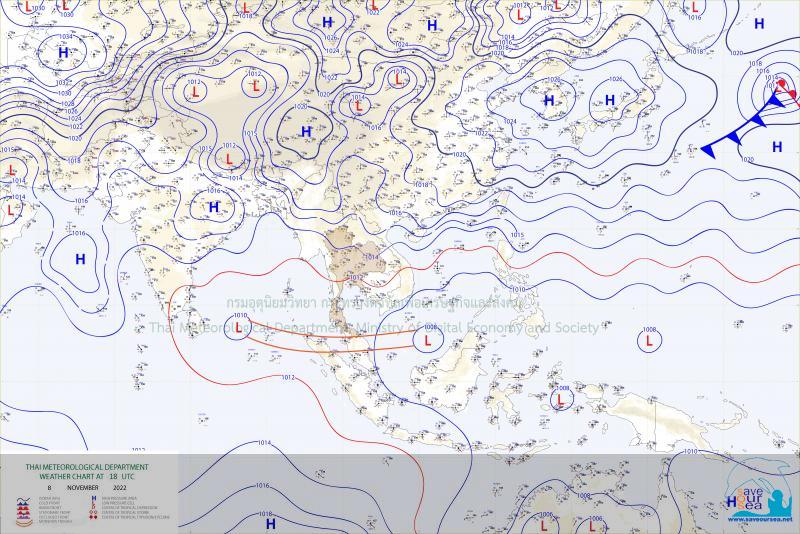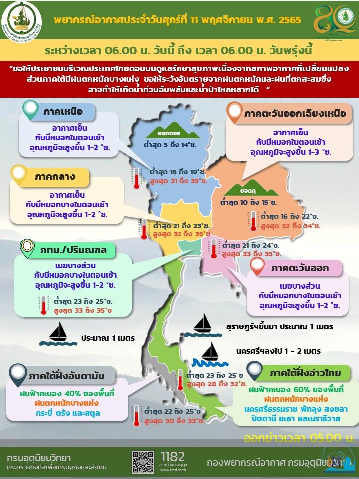 สภาวะอากาศทั่วไป พยากรณ์อากาศ 24 ชั่วโมงข้างหน้า บริเวณความกดอากาศสูงหรือมวลอากาศเย็นที่ปกคลุมประเทศไทยตอนบนเริ่มมีกำลังอ่อนลง ลักษณะเช่นนี้ทำให้ประเทศไทยตอนบนยังคงมีอากาศเย็น กับมีหมอกในตอนเช้า และอุณหภูมิจะสูงขึ้น 1-3 องศาเซลเซียส ในภาคเหนือตอนล่าง ภาคตะวันออกเฉียงเหนือ ภาคกลางรวมทั้งกรุงเทพมหานครและปริมณฑล และภาคตะวันออก ขอให้ประชาชนในบริเวณดังกล่าวดูแลรักษาสุขภาพเนื่องจากสภาพอากาศที่เปลี่ยนแปลงในระยะนี้ไว้ด้วย สำหรับร่องมรสุมพาดผ่านทางตอนล่างของภาคใต้เข้าสู่หย่อมความกดอากาศต่ำที่ปกคลุมบริเวณด้านตะวันออกของประเทศมาเลเซีย ประกอบกับมรสุมตะวันออกเฉียงเหนือยังคงพัดปกคลุมอ่าวไทย ภาคใต้ และทะเลอันดามัน ลักษณะเช่นนี้ทำให้ภาคใต้ตอนล่างมีฝนตกเพิ่มขึ้น และมีฝนตกหนักบางแห่ง ขอให้ประชาชนบริเวณดังกล่าวระวังอันตรายจากฝนตกหนักและฝนที่ตกสะสมซึ่งอาจทำให้เกิดน้ำท่วมฉับพลันและน้ำป่าไหลหลากได้ ฝุ่นละอองในระยะนี้: ฝุ่นละออง/หมอกควันบริเวณประเทศไทยและกรุงเทพมหานครในระยะนี้ยังมีน้อย เนื่องจากมรสุมตะวันออกเฉียงเหนือยังคงปกคลุมประเทศไทยตอนบน กรุงเทพมหานครและปริมณฑล เมฆบางส่วนกับมีหมอกบางในตอนเช้า และอุณหภูมิจะสูงขึ้น 1-2 องศาเซลเซียส อุณหภูมิต่ำสุด 23-25 องศาเซลเซียส อุณหภูมิสูงสุด 33-35 องศาเซลเซียส ลมตะวันออกเฉียงเหนือ ความเร็ว 10-20 กม./ชม. คาดหมาย ในช่วงวันที่ 11 ? 16 พ.ย. 65 บริเวณความกดอากาศสูงหรือมวลอากาศเย็นกำลังปานกลางที่ปกคลุมประเทศไทยตอนบนมีกำลังอ่อนลง ในขณะที่ ในช่วงวันที่ 13 ? 16 พ.ย. 65 ลมตะวันออกและลมตะวันออกเฉียงใต้พัดปกคลุมภาคเหนือตอนล่าง ภาคตะวันออกเฉียงเหนือตอนล่าง ภาคกลางรวมทั้งกรุงเทพมหานครและปริมณฑล และภาคตะวันออก ลักษณะเช่นนี้ทำให้ประเทศไทยตอนบนยังคงมีอากาศเย็น กับมีหมอกในตอนเช้า และอุณหภูมิจะสูงขึ้น 1-3 องศาเซลเซียสในภาคเหนือ ภาคกลาง และภาคตะวันออก ส่วนภาคตะวันออกเฉียงเหนืออุณหภูมิจะสูงขึ้น 2-4 องศาเซลเซียส โดยมีฝนฟ้าคะนองบริเวณภาคตะวันออกเฉียงเหนือตอนล่าง ภาคกลาง รวมทั้งกรุงเทพมหานครและปริมณฑล และภาคตะวันออก สำหรับหย่อมความกดอากาศต่ำปกคลุมประเทศมาเลเซีย ในขณะที่มรสุมตะวันออกเฉียงเหนือและลมตะวันออกที่พัดปกคลุมอ่าวไทย ภาคใต้ และทะเลอันดามันจะมีกำลังแรงขึ้น ทำให้ภาคใต้มีฝนเพิ่มขึ้นและมีฝนตกหนักบางแห่ง ข้อควรระวัง ขอให้ประชาชนบริเวณประเทศไทยตอนบนดูแลรักษาสุขภาพเนื่องจากอากาศที่เปลี่ยนแปลงไว้ด้วย ตลอดช่วง สำหรับในช่วงวันที่ 11 ? 16 พ.ย. 65 ประชาชนบริเวณภาคใต้ระวัง