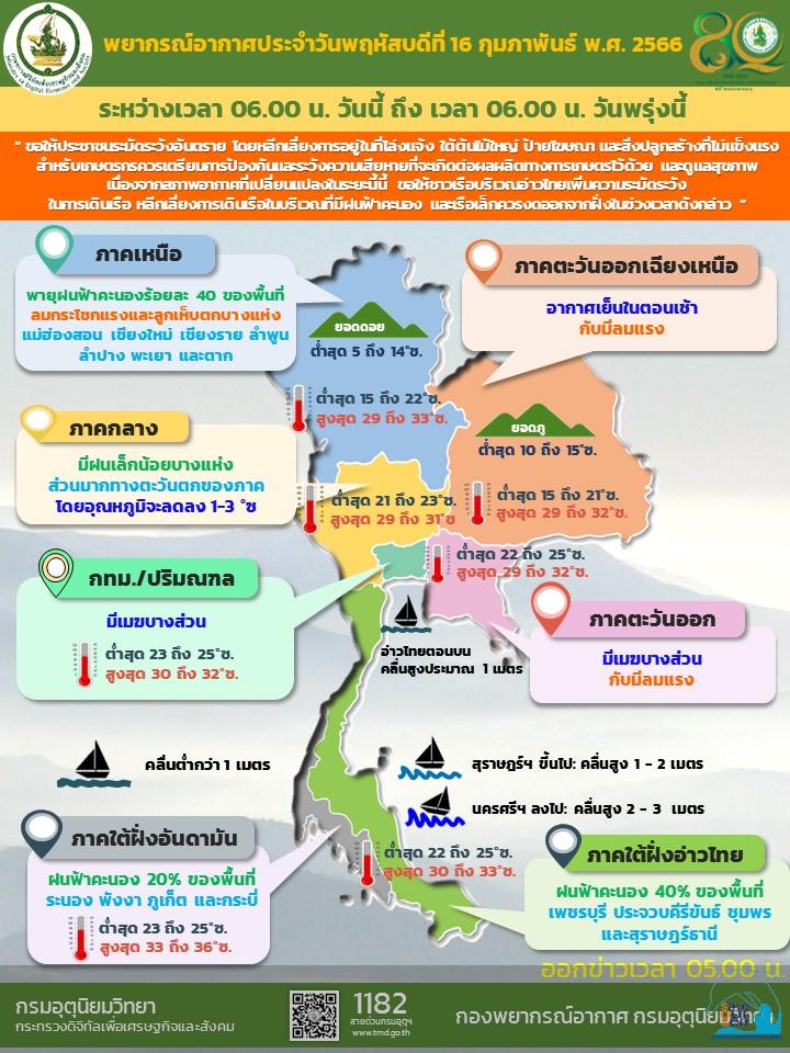 สภาวะอากาศทั่วไป พยากรณ์อากาศ 24 ชั่วโมงข้างหน้า คลื่นกระแสลมฝ่ายตะวันตกจะเคลื่อนผ่านภาคเหนือ ในช่วงวันที่ 16 ? 17 ก.พ. 66 ทำให้ภาคเหนือ มีพายุฝนฟ้าคะนอง ลมกระโชกแรง และลูกเห็บตกบางแห่ง ขอให้ประชาชนระมัดระวังอันตรายดังกล่าว โดยหลีกเลี่ยงการอยู่ในที่โล่งแจ้ง ใต้ต้นไม้ใหญ่ ป้ายโฆษณา และสิ่งปลูกสร้างที่ไม่แข็งแรง สำหรับเกษตรกรควรเตรียมการป้องกันและระวังความเสียหายที่จะเกิดต่อผลผลิตทางการเกษตรไว้ด้วย และดูแลสุขภาพเนื่องจากสภาพอากาศที่เปลี่ยนแปลงในระยะนี้ ส่วนบริเวณความกดอากาศสูงกำลังค่อนข้างแรงจากประเทศจีนปกคลุมภาคตะวันออกเฉียงเหนือ ภาคกลาง ภาคตะวันออก และภาคเหนือตอนล่าง ทำให้ประเทศไทยตอนบนมีอากาศเย็นในตอนเช้า โดยมีลมแรงในภาคตะวันออกเฉียงเหนือ และภาคตะวันออก สำหรับลมตะวันออกและลมตะวันออกเฉียงใต้ที่พัดปกคลุมอ่าวไทย ภาคใต้ และทะเลอันดามันจะมีกำลังแรงขึ้น ทำให้ภาคใต้มีฝนเพิ่มขึ้น และคลื่นลมบริเวณอ่าวไทยมีกำลังค่อนข้างแรง โดยอ่าวไทยตอนล่างมีคลื่นสูง 2 - 3 เมตร บริเวณที่มีฝนฟ้าคะนองคลื่นสูงมากกว่า 3 เมตร ขอให้ชาวเรือบริเวณอ่าวไทยเพิ่มความระมัดระวังในการเดินเรือ หลีกเลี่ยงการเดินเรือในบริเวณที่มีฝนฟ้าคะนอง และเรือเล็กควรงดออกจากฝั่งในช่วงเวลาดังกล่าว ฝุ่นละอองในระยะนี้: ภาคเหนือมีการสะสมฝุ่นละออง/หมอกควันมากเนื่องจากมีการระบายอากาศไม่ดี ส่วนภาคอื่นๆ มีฝุ่นละอองสะสมอยู่ในเกณฑ์เล็กน้อยถึงปานกลาง เนื่องจากลมที่พัดปกคลุมมีกำลังแรงขึ้น กรุงเทพมหานครและปริมณฑล มีเมฆบางส่วน อุณหภูมิต่ำสุด 23-25 องศาเซลเซียส อุณหภูมิสูงสุด 30-32 องศาเซลเซียส ลมตะวันออกเฉียงใต้ ความเร็ว 10-20 กม./ชม. คาดหมาย ในช่วงวันที่ 15 ? 17 ก.พ. 66 บริเวณความกดอากาศสูงหรือมวลอากาศเย็นกำลังค่อนข้างแรงจากประเทศจีนแผ่ลงมาปกคลุมประเทศไทยตอนบนและทะเลจีนใต้ ในขณะที่ในช่วงวันที่ 16 ? 19 ก.พ. 66 คลื่นกระแสลมฝ่ายตะวันตกจะเคลื่อนผ่านภาคเหนือและภาคตะวันออกเฉียงเหนือตอนบน ทำให้บริเวณดังกล่าวจะมีพายุฝนฟ้าคะนอง ลมกระโชกแรง และลูกเห็บตกบางแห่งเกิดขึ้นในระยะแรก หลังจากนั้นบริเวณประเทศไทยตอนบนอุณหภูมิจะลดลงกับมีลมแรง โดยอุณหภูมิจะลดลง 2 ? 4 องศาเซลเซียส สำหรับลมตะวันออกและลมตะวันออกเฉียงใต้ที่พัดปกคลุมอ่าวไทย ภาคใต้ และทะเลอันดามันจะมีกำลังแรงขึ้น ทำให้ภาคใต้มีฝนเพิ่มขึ้น ส่วนคลื่นลมบริเวณอ่าวไทยและทะเลอันดามันจะมีกำลังแรงขึ้น โดยอ่าวไทยตอนบนและทะเลอันดามันมีคลื่นสูง 1 ? 2 เมตร อ่าวไทยตอนล่างมีคลื่นสูง 2 - 3 เมตร บริเวณที่มีฝนฟ้าคะนองค