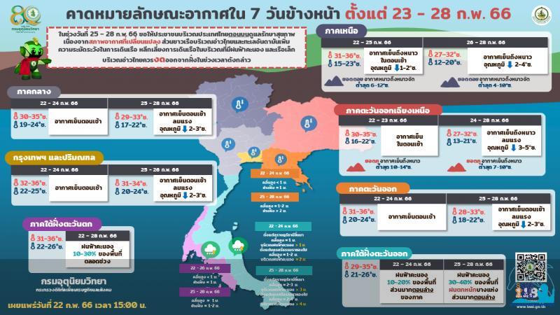 ในช่วงวันที่ 23 ? 24 ก.พ. 66 บริเวณความกดอากาศสูงหรือมวลอากาศเย็นกำลังปานกลางปกคลุมประเทศไทยตอนบน ทำให้ประเทศไทยตอนบนยังคงมีอากาศเย็นถึงหนาวในตอนเช้า ส่วนมรสุมตะวันออกเฉียงเหนือที่พัดปกคลุมอ่าวไทย ภาคใต้ และทะเลอันดามัน ทำให้ภาคใต้มีฝนน้อย ส่วนคลื่นลมบริเวณอ่าวไทยตอนล่างคลื่นสูง 1 ? 2 เมตร บริเวณที่มีฝนฟ้าคะนองคลื่นสูงมากกว่า 2 เมตร สำหรับในช่วงวันที่ 25 ? 27 ก.พ. 66 บริเวณความกดอากาศสูงหรือมวลอากาศเย็นกำลังแรงจากประเทศจีนจะแผ่เสริมลงมาปกคลุมประเทศไทยตอนบนและทะเลจีนใต้ ทำให้ประเทศไทยตอนบนมีอากาศหนาวเย็นลง อุณหภูมิจะลดลง 2 - 4 องศาเซลเซียส กับมีลมแรง ส่วนมรสุมตะวันออกเฉียงเหนือที่พัดปกคลุมอ่าวไทย ภาคใต้ และทะเลอันดามันจะมีกำลังแรงขึ้น ทำให้ภาคใต้ตอนล่างมีฝนเพิ่มขึ้นและมีฝนตกหนักบางแห่ง คลื่นลมบริเวณอ่าวไทยมีกำลังค่อนข้างแรง โดยมีคลื่นสูง 2 - 4 เมตร บริเวณที่มีฝนฟ้าคะนองคลื่นสูงมากกว่า 4 เมตร ส่วนทะเลอันดามันห่างฝั่งมีคลื่นสูง 1 - 2 เมตร ส่วนในช่วงวันที่ 28 ก.พ. ? 1 มี.ค. 66 บริเวณความกดอากาศสูงหรือมวลอากาศเย็นที่ปกคลุมประเทศไทยตอนบนมีเริ่มกำลังอ่อนลง ทำให้บริเวณดังกล่าวมีอุณหภูมิสูงขึ้น กับมีหมอกในตอนเช้า