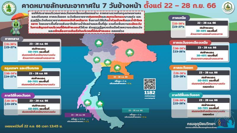 สภาวะอากาศทั่วไป ร่องมรสุมพาดผ่านภาคกลางตอนล่างรวมทั้งกรุงเทพมหานครและปริมณฑล ภาคตะวันออก และภาคใต้ตอนบนประกอบกับมรสุมตะวันตกเฉียงใต้ที่พัดปกคลุมทะเลอันดามัน ภาคใต้ และอ่าวไทย มีกำลังแรงขึ้น ลักษณะเช่นนี้ทำให้ประเทศไทยยังคงมีฝนฟ้าคะนอง และมีฝนตกหนักบางแห่งในภาคกลางรวมทั้งกรุงเทพมหานครและปริมณฑล และภาคตะวันออก โดยมีฝนตกหนักมากบริเวณภาคใต้ ขอให้ประชาชนในบริเวณดังกล่าวระวังอันตรายจากฝนตกหนักถึงหนักมาก ซึ่งอาจทำให้เกิดน้ำท่วมฉับพลันและน้ำป่าไหลหลาก โดยเฉพาะพื้นที่ลาดเชิงเขาใกล้ทางน้ำไหลผ่านและพื้นที่ลุ่ม รวมทั้งเพิ่มความระมัดระวังในการสัญจรผ่านบริเวณที่มีฝนฟ้าคะนองและหลีกเลี่ยงการอยู่ในที่โล่งแจ้ง ใต้ต้นไม้ใหญ่ และป้ายโฆษณาที่ไม่แข็งแรง สำหรับคลื่นลมบริเวณทะเลอันดามัน มีคลื่นสูง 1-2 เมตร บริเวณที่มีฝนฟ้าคะนองคลื่นสูงมากกว่า 2 เมตร และอ่าวไทยทะเลมีคลื่นสูงประมาณ 1 เมตร บริเวณที่มีฝนฟ้าคะนองคลื่นสูงมากกว่า 2 เมตร ขอให้ชาวเรือบริเวณดังกล่าวเดินเรือด้วยความระมัดระวังและหลีกเลี่ยงการเดินเรือในบริเวณที่มีฝนฟ้าคะนองในระยะนี้ กรุงเทพมหานครและปริมณฑล มีฝนฟ้าคะนอง ร้อยละ 70 ของพื้นที่ และมีฝนตกหนักบางแห่ง อุณหภูมิต่ำสุด 24-26 องศาเซลเซียส อุณหภูมิสูงสุด 33-36 องศาเซลเซียส ลมแปรปรวน ความเร็ว 10-20 กม./ชม. คาดหมาย ในช่วงวันที่ 23 ? 28 ก.ย. 66 ร่องมรสุมพาดผ่านภาคกลางตอนล่างรวมทั้งกรุงเทพมหานครและปริมณฑล ภาคตะวันออก และภาคใต้ตอนบนประกอบกับมรสุมตะวันตกเฉียงใต้ที่พัดปกคลุมทะเลอันดามัน ภาคใต้ และอ่าวไทย จะมีกำลังแรงขึ้น ลักษณะเช่นนี้ทำให้ประเทศไทศไทยยังคงมีฝนฟ้าคะนอง และมีฝนตกหนักถึงหนักมากบางแห่งในภาคกลางรวมทั้งกรุงเทพมหานครและปริมณฑล ภาคตะวันออก และภาคใต้ สำหรับคลื่นลมบริเวณทะเลอันดามัน มีคลื่นสูง 1 - 2 เมตร บริเวณที่มีฝนฟ้าคะนองคลื่นสูงมากกว่า 2 เมตร และอ่าวไทยทะเลมีคลื่นสูงประมาณ 1 เมตร บริเวณที่มีฝนฟ้าคะนองคลื่นสูงมากกว่า 2 เมตร ข้อควรระวัง ขอให้ประชาชนบริเวณภาคตะวันออกเฉียงเหนือตอนล่าง ภาคกลางรวมทั้งกรุงเทพมหานครและปริมณฑล ภาคตะวันออก ระวังอันตรายจากฝนตกหนักและลมกระโชกแรงบางแห่ง และภาคใต้ระวังอันตรายจากฝนตกหนักถึงหนักมาก ซึ่งอาจทำให้เกิดน้ำท่วมฉับพลันและน้ำป่าไหลหลาก โดยเฉพาะพื้นที่ลาดเชิงเขาใกล้ทางน้ำไหลผ่านและพื้นที่ลุ่ม รวมทั้งเพิ่มความระมัดระวังในการสัญจรผ่านบริเวณที่มีฝนฟ้าคะนองไว้ด้วย ส่วนชาวเรือควรเดินเรือด้วยความระมัดระวังและหลีกเลี่ยงการเดินเรือในบริเวณที่