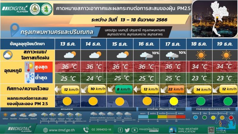 สภาวะอากาศทั่วไป พยากรณ์อากาศ 24 ชั่วโมงข้างหน้า บริเวณความกดอากาศสูงหรือมวลอากาศเย็นอีกระลอกหนึ่งจากประเทศจีนแผ่ลงมาปกคลุมภาคตะวันออกเฉียงเหนือตอนบนของประเทศไทยและทะเลจีนใต้ ลักษณะเช่นนี้ทำให้ประเทศไทยตอนบนมีหมอกในตอนเช้า ภาคเหนือและภาคตะวันออกเฉียงเหนือยังคงมีอากาศเย็นในตอนเช้า ในขณะที่มีคลื่นกระแสลมฝ่ายตะวันตกพัดปกคลุมภาคเหนือตอนบน ทำให้บริเวณดังกล่าวมีฝนฟ้าคะนองบางแห่ง ขอให้ประชาชนบริเวณประเทศไทยตอนบนดูแลรักษาสุขภาพเนื่องจากสภาพอากาศที่เปลี่ยนแปลงและระมัดระวังในการสัญจรผ่านบริเวณที่มีหมอกไว้ด้วย สำหรับมรสุมตะวันออกเฉียงเหนือที่พัดปกคลุมอ่าวไทยและภาคใต้เริ่มมีกำลังแรงขึ้น ทำให้ภาคใต้ตอนล่างมีฝนฟ้าคะนองเพิ่มขึ้น ส่วนคลื่นลมบริเวณอ่าวไทยตอนล่างสูง 1 - 2 เมตร และบริเวณที่มีฝนฟ้าคะนองคลื่นสูงมากกว่า 2 เมตร กรุงเทพมหานครและปริมณฑล มีหมอกบางในตอนเช้า อุณหภูมิต่ำสุด 25-26 องศาเซลเซียส อุณหภูมิสูงสุด 34-36 องศาเซลเซียส ลมตะวันออก ความเร็ว 10-15 กม./ชม. คาดหมาย ในช่วงวันที่ 13 ? 16 ธ.ค. 66 บริเวณความกดอากาศสูงหรือมวลอากาศเย็นกำลังอ่อนอีกระลอกหนึ่งจากประเทศจีนจะแผ่ลงมาปกคลุมภาคเหนือ และภาคตะวันออกเฉียงเหนือของประเทศไทย และทะเลจีนใต้ ในขณะที่มีคลื่นกระแสลมฝ่ายตะวันตกเคลื่อนผ่านภาคเหนือตอนบน ลักษณะเช่นนี้ทำให้บริเวณดังกล่าวยังคงมีอากาศเย็นในตอนเช้า และมีฝนฟ้าคะนองบางแห่งในภาคเหนือ สำหรับมรสุมตะวันออกเฉียงเหนือที่พัดปกคลุมอ่าวไทยและภาคใต้มีกำลังปานกลาง ทำให้ภาคใต้ตอนล่างมีฝนตกหนักบางแห่ง ส่วนคลื่นบริเวณอ่าวไทยตอนบนและทะเลอันดามัน มีคลื่นสูงประมาณ 1 เมตร บริเวณที่มีฝนฟ้าคะนองคลื่นสูงมากกว่า 1 เมตร อ่าวไทยตอนล่างมีคลื่นสูง 1 - 2 เมตร บริเวณที่มีฝนฟ้าคะนองคลื่นสูงมากกว่า 2 เมตร ส่วนในช่วงวันที่ 17 - 18 ธ.ค. 66 บริเวณความกดอากาศสูงหรือมวลอากาศเย็นกำลังค่อนข้างแรงอีกระลอกหนึ่งจากประเทศจีนจะแผ่เสริมลงมาปกคลุมประเทศไทยตอนบนและทะเลจีนใต้ ทำให้บริเวณดังกล่าวมีอุณหภูมิลดลงกับมีลมแรง โดยบริเวณภาคเหนือและภาคตะวันออกเฉียงเหนือ อุณหภูมิจะลดลง 2 ? 4 องศาเซลเซียส ส่วนภาคกลาง รวมทั้งกรุงเทพมหานครและปริมณฑล และภาคตะวันออก อุณหภูมิจะลดลง 1 ? 3 องศาเซลเซียส สำหรับมรสุมตะวันออกเฉียงเหนือที่พัดปกคลุมอ่าวไทยและภาคใต้เริ่มมีกำลังแรงขึ้น ทำให้ภาคใต้ตอนล่างมีฝนตกหนักถึงหนักมากบางแห่ง ส่วนคลื่นลมบริเวณ อ่าวไทยมีกำลังแรงขึ้น โดยบริเวณอ่าวไทยตอนบน มีคลื่นสูง 1 - 2 เมตร บริเวณที่มีฝนฟ้าคะนองคลื่นสูงมากก